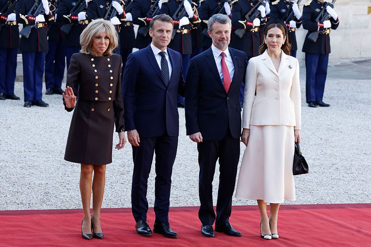 Brigitte Macron et Emmanuel Macron accueillent le roi Frederik X du Danemark et la reine Mary du Danemark lors de la première journée de leur visite d'État en France au palais de l'Élysée, le 31 mars 2025 à Paris, en France. (Photo par Jean Catuffe/Getty Images)