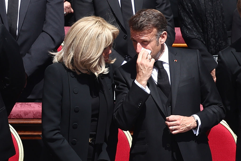 Le président français Emmanuel Macron et Brigitte Macron avant la cérémonie funéraire du pape François sur la place Saint-Pierre au Vatican, le 26 avril 2025. (Photo de Jakub Porzycki/NurPhoto via Getty Images)