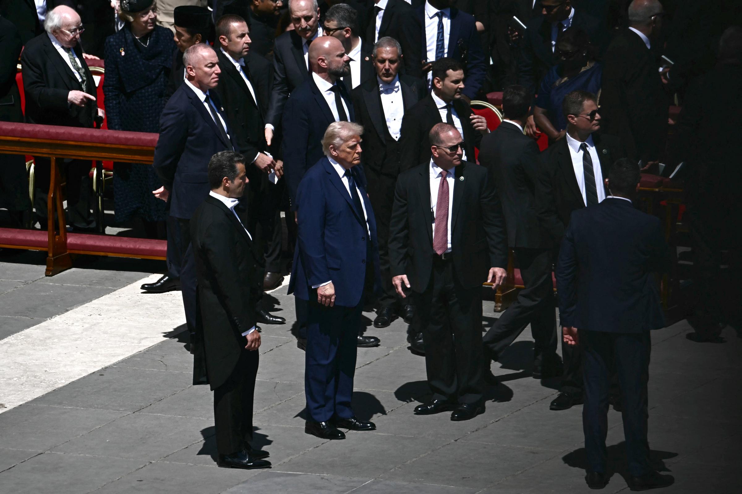 Donald Trump se tient aux côtés d'autres dignitaires en regardant la cérémonie funéraire du pape François sur la place Saint-Pierre. | Source : Getty Images