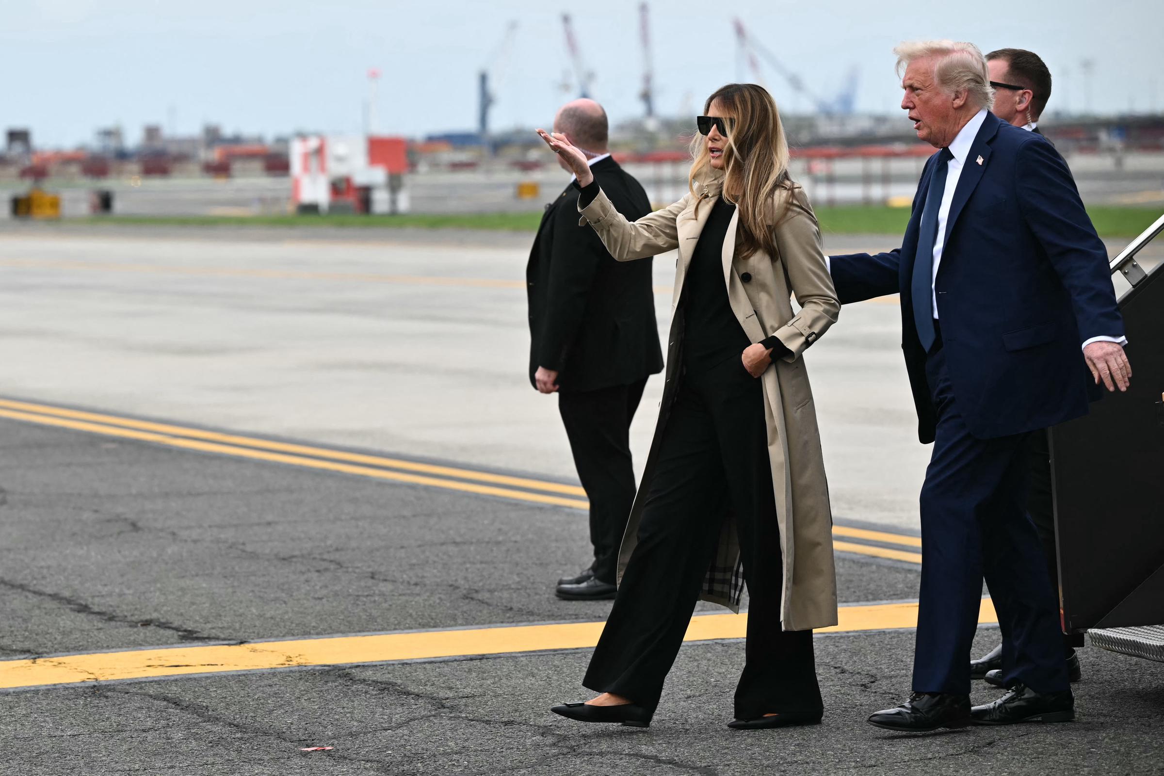 Le président Donald Trump s'entretient avec La Première Dame Melania Trump à l'aéroport international Newark Liberty de Newark, dans le New Jersey, le 26 avril 2025. | Source : Getty Images