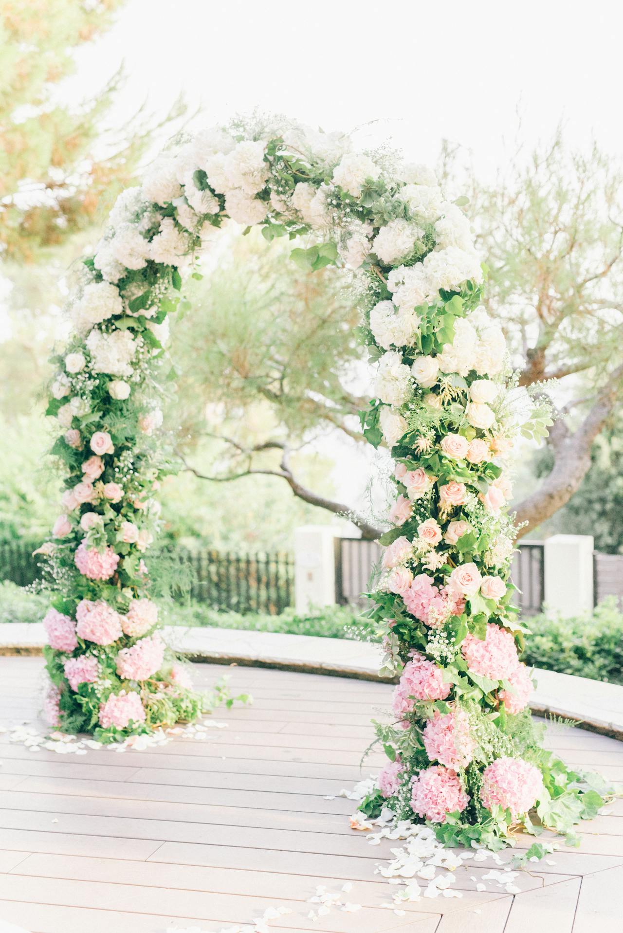 Une arche de mariage avec des fleurs épanouies roses et blanches | Source : Pexels