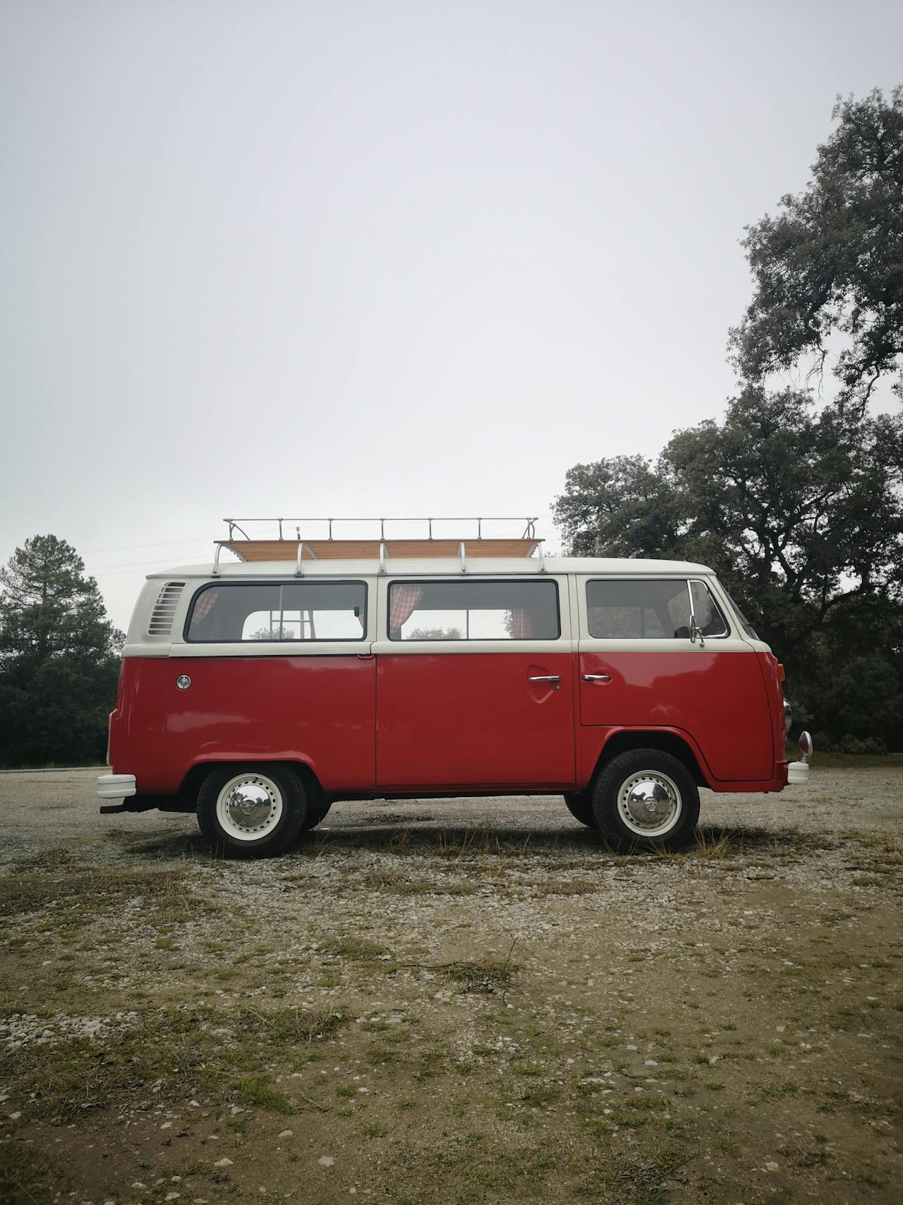 Un monospace vintage rouge garé sur une pelouse stérile | Source : Pexels