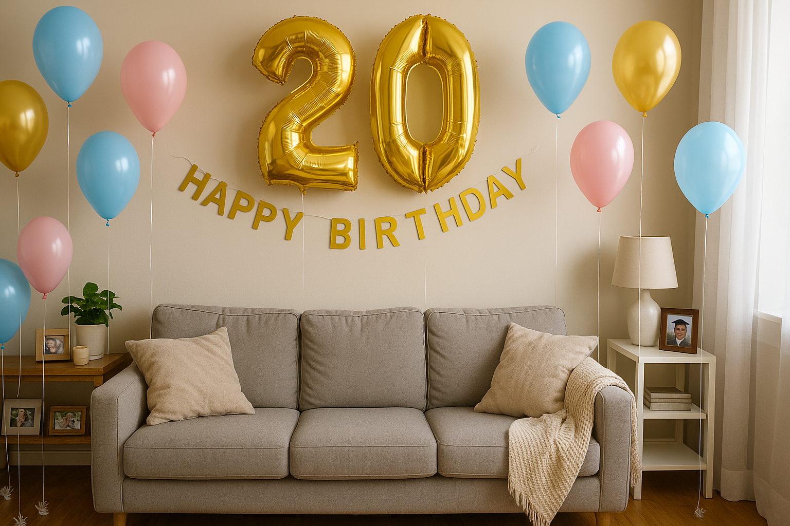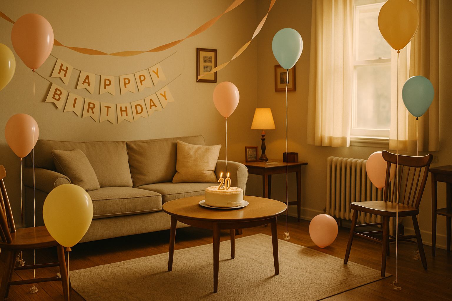 Des ballons flottaient à différentes hauteurs, attachés à des chaises et à des pieds de table. Certains se heurtaient doucement au plafond, comme s'ils étaient trop excités pour rester immobiles.