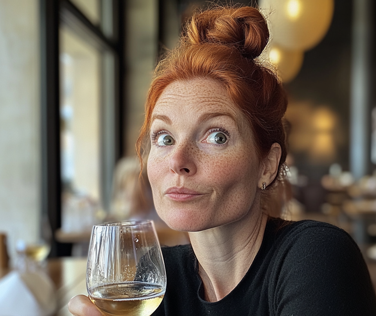 Une femme surprise tenant un verre de vin | Source : Midjourney