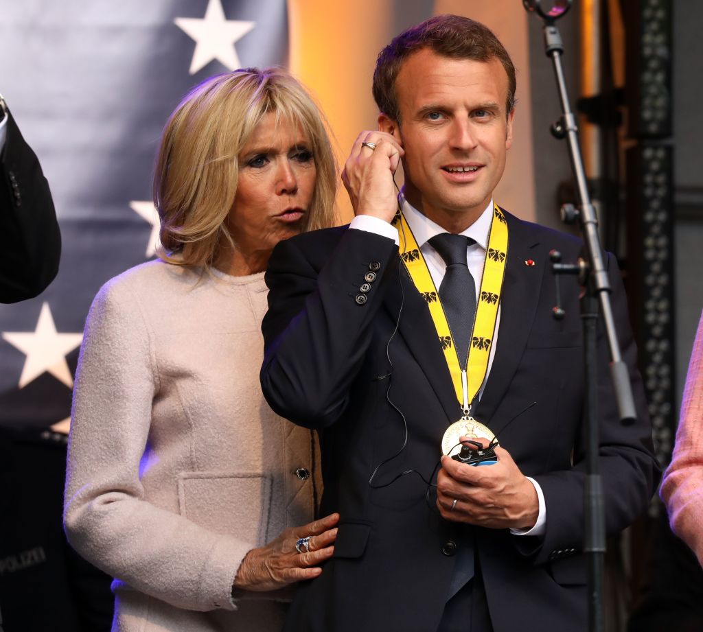Emmanuel Macron s'entretient avec son épouse Brigitte Macron à la fin de la cérémonie de remise du prix Charlemagne, le 10 mai 2018 à Aix-la-Chapelle, dans l'ouest de l'Allemagne.