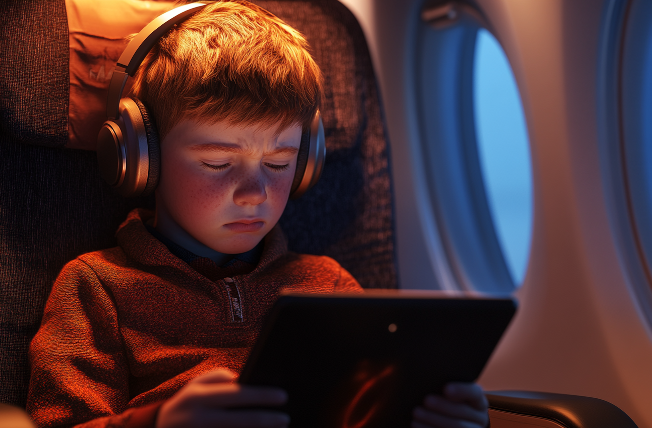Un garçon portant des écouteurs assis à l'intérieur d'un avion | Source : Midjourney