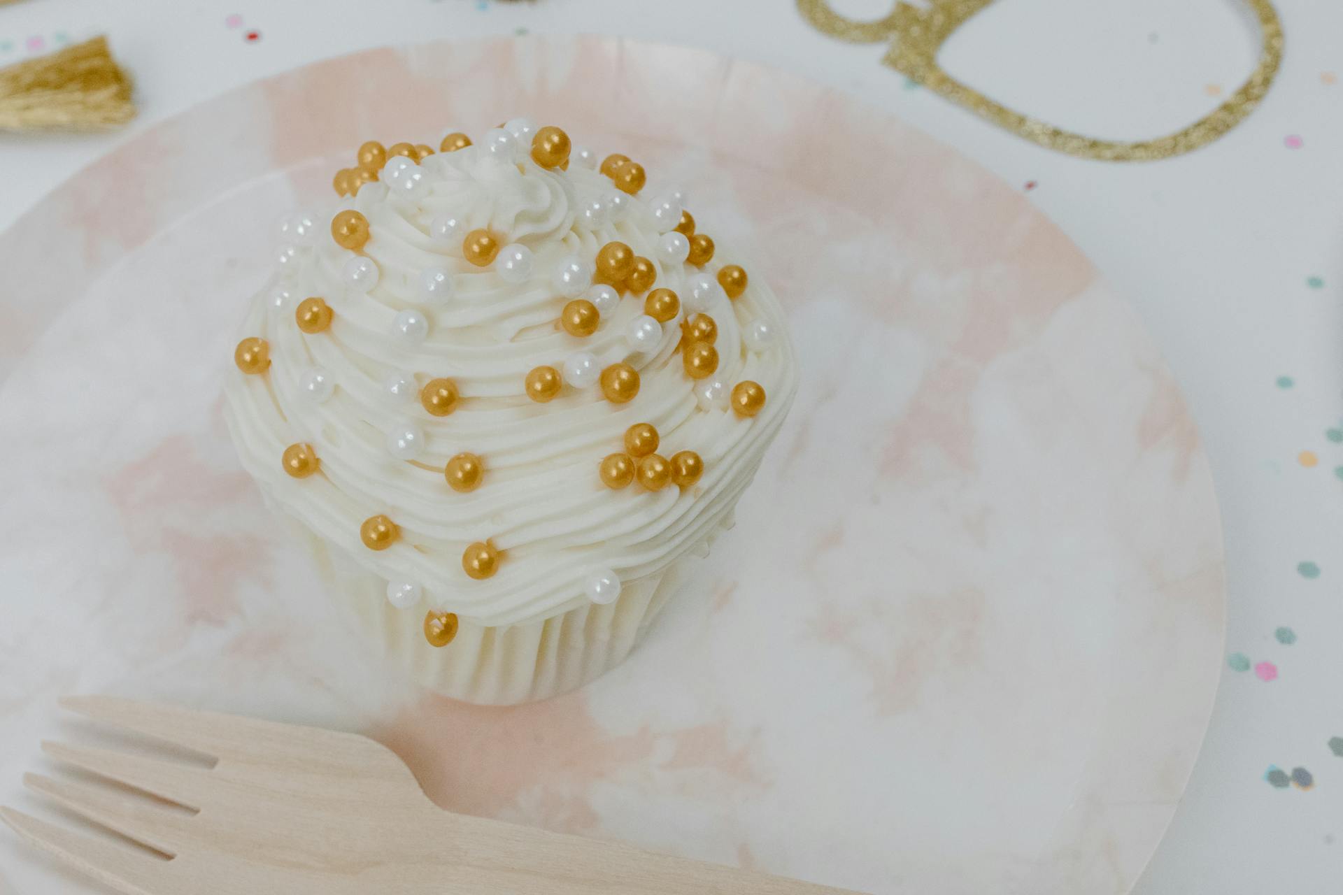 Un cupcake avec des perles dorées et blanches | Source : Pexels