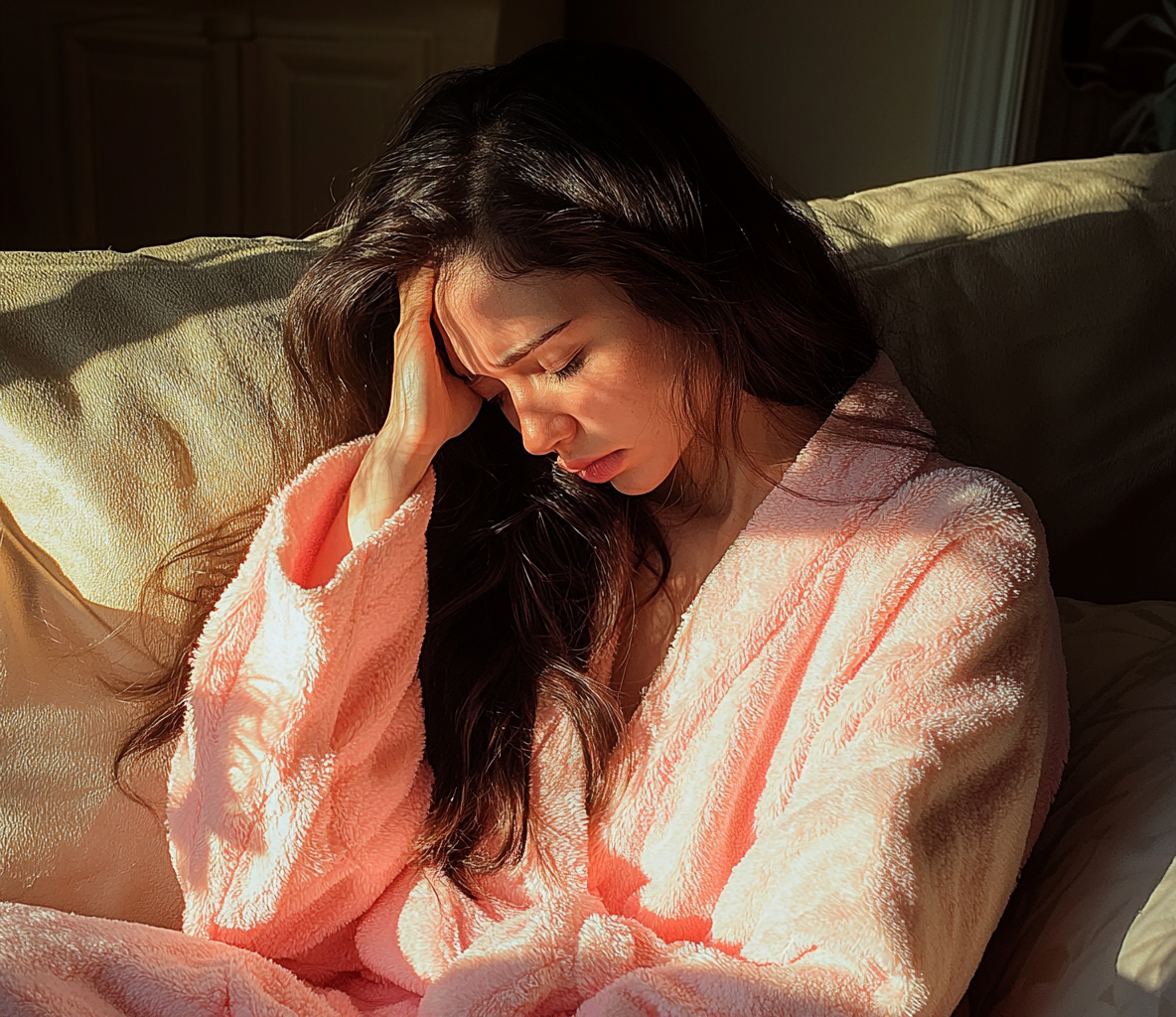 Une femme assise sur un canapé et portant une robe de chambre rose | Source : Midjourney