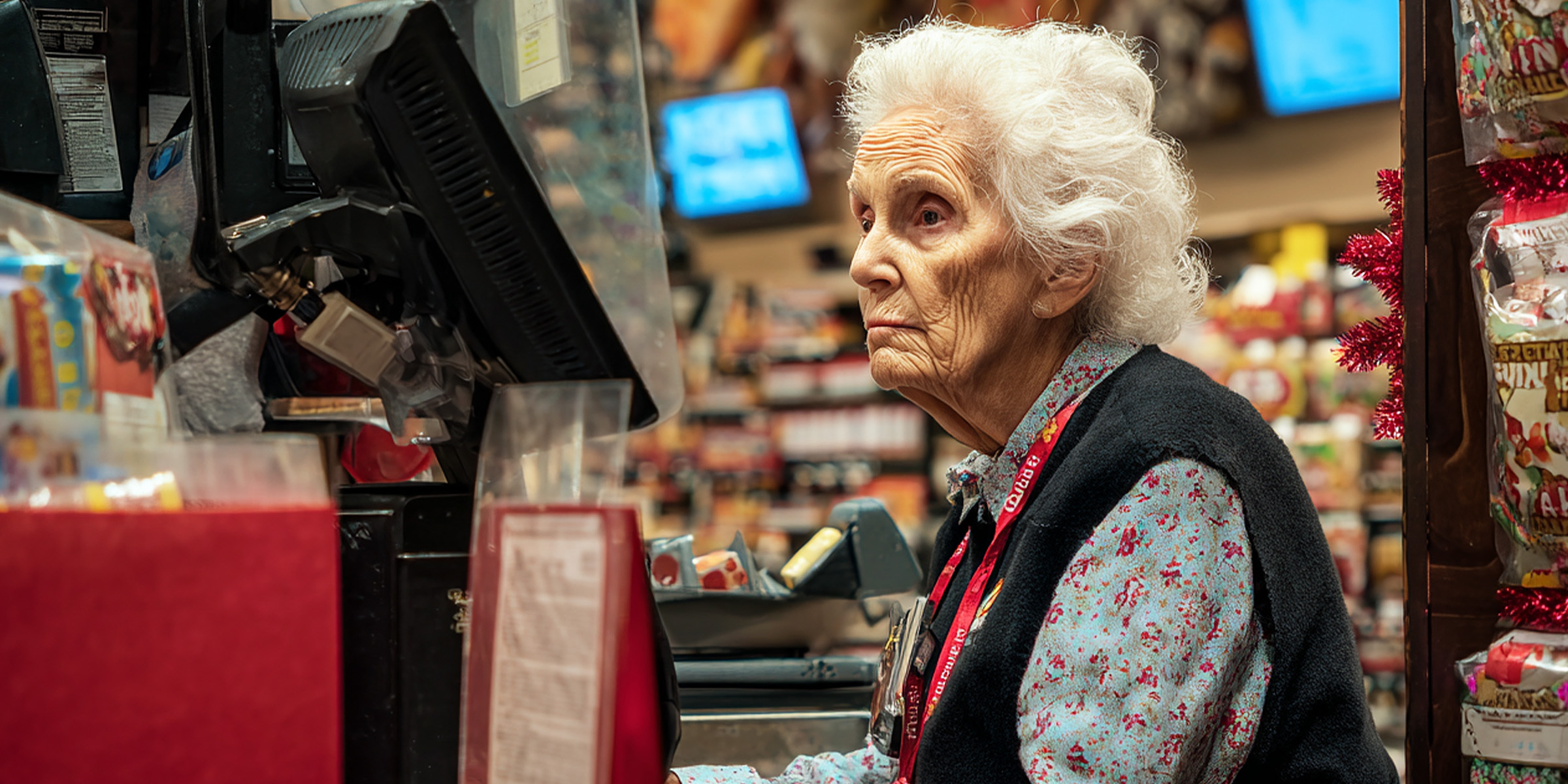 Les files d'attente à la caisse étaient courtes. J'ai choisi celle qui était la plus proche de la sortie — il n'y avait qu'une personne devant moi. La caissière semblait avoir environ 70 ans. Ses cheveux argentés étaient tirés en arrière avec un fin bandeau, et ses mains tremblaient juste assez pour me serrer le cœur.